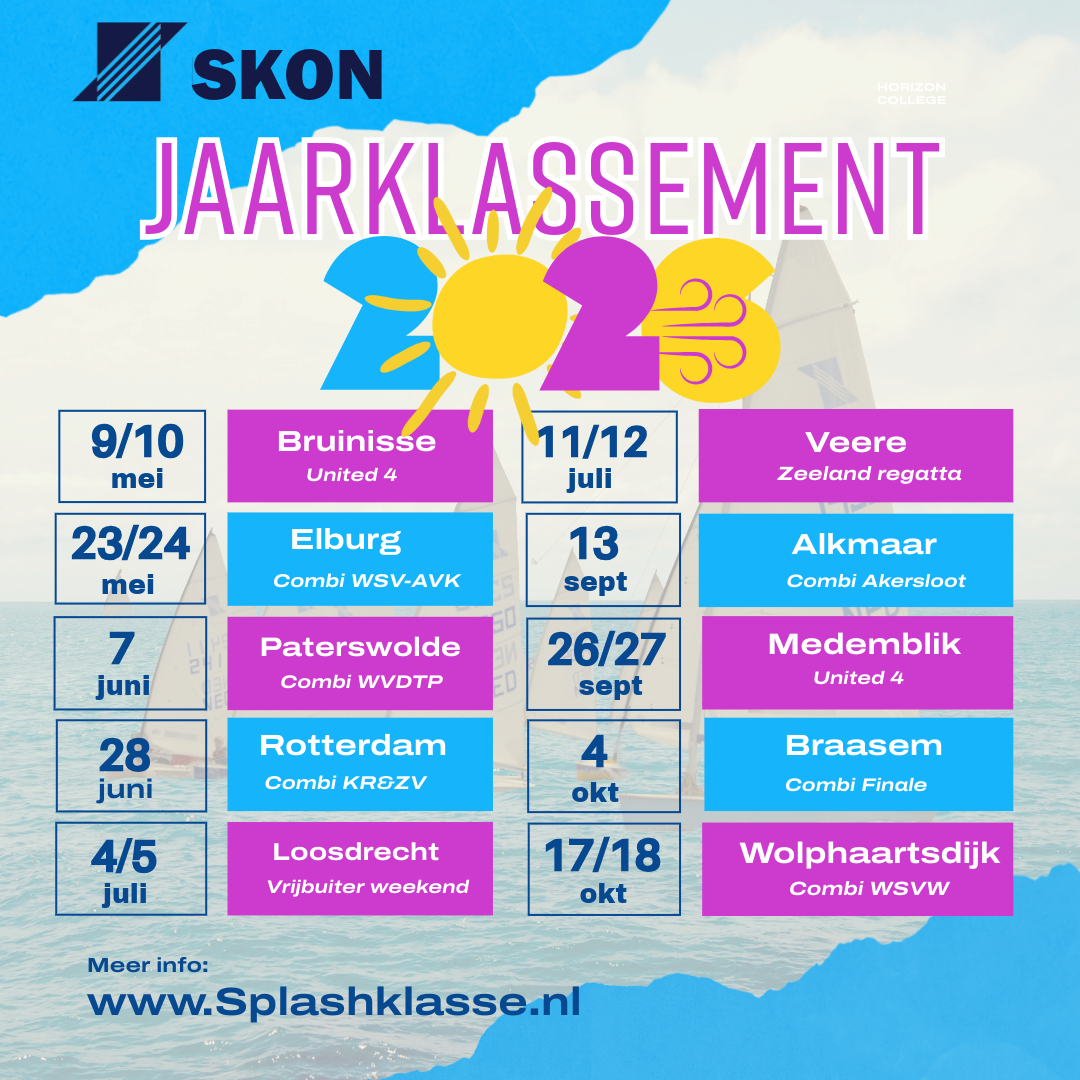 Dit is de wedstrijd kalender van 2026. Hierbij is zorgvuldig afgewogen welke wedstrijden we opnemen in het jaar klassement. Hierbij is rekening gehouden met deelname aan groot water evenementen (zoals een U4) en wedstrijden in de buurt. Daarbij wordt aangesloten bij de lokale combi’s waar of al Splashes varen of waar veel optimisten zeilers zijn die straks mogelijk een overstap moeten maken naar een ‘grotere’ boot. Ook is er zoveel mogelijk een gekeken naar een evenwichtige verdeling over het land.